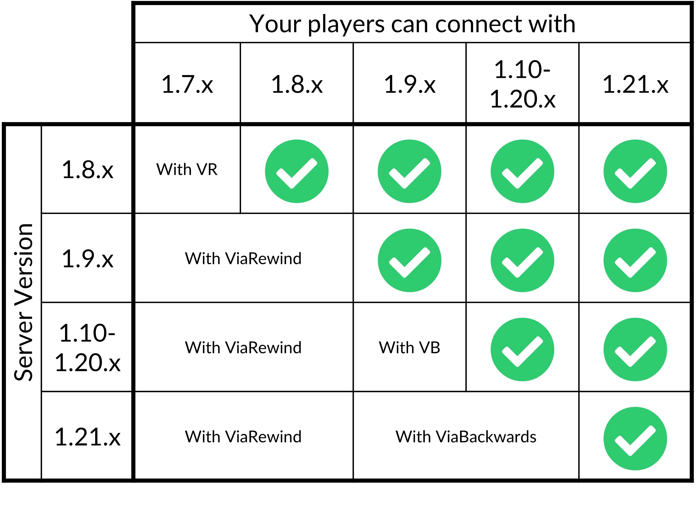 Section titled “支持的服务器”ViaVersion + ViaBackwards + ViaRewind